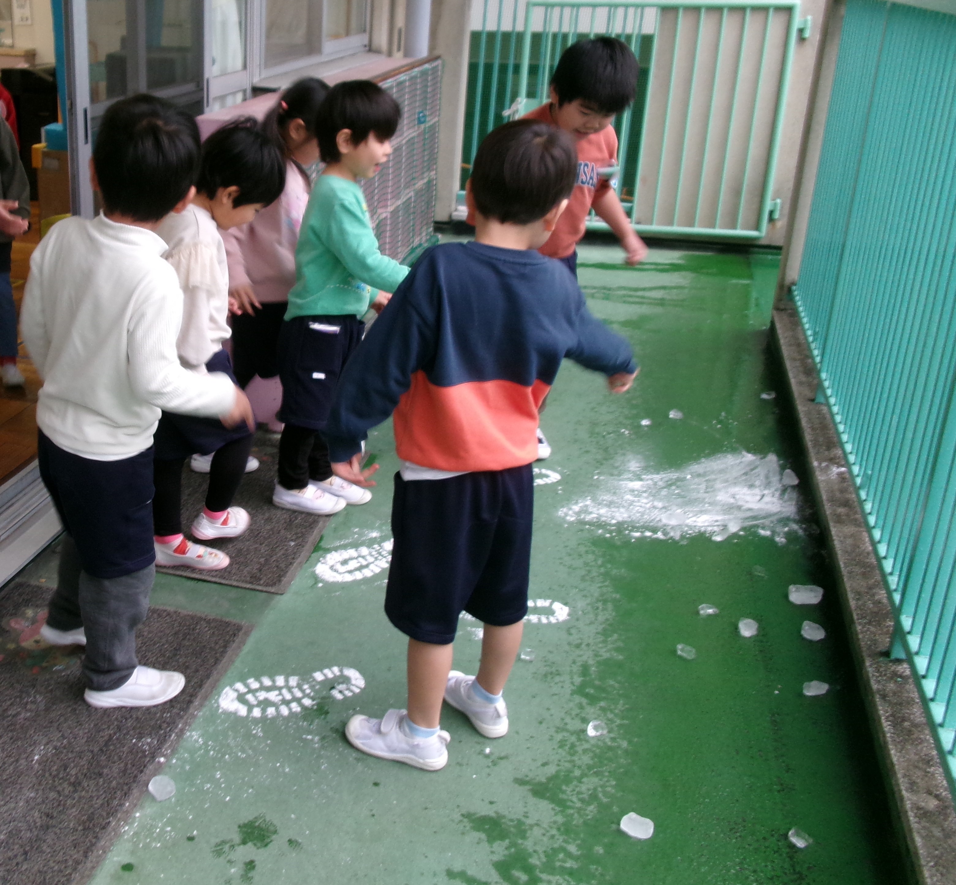 2学期の終わりに、「もも組とあお組で一緒に楽しい時間を過ごそう!」と、24日(水)にお楽しみ会を行いました。クリスマスツリーやみんなが作った飾りがホールを彩る中、教師のお楽しみでブラックライトシアターを観たり、みんなで歌ったりしました。途中でなんとサンタさんからの手紙が…!どこからかこっそりみんなのことを見ていたサンタさんが、プレゼントを置いていってくれました。テラスにはサンタさんの足跡を発見!プレゼントを探し出し、驚きと喜びで大興奮の子どもたちでした。