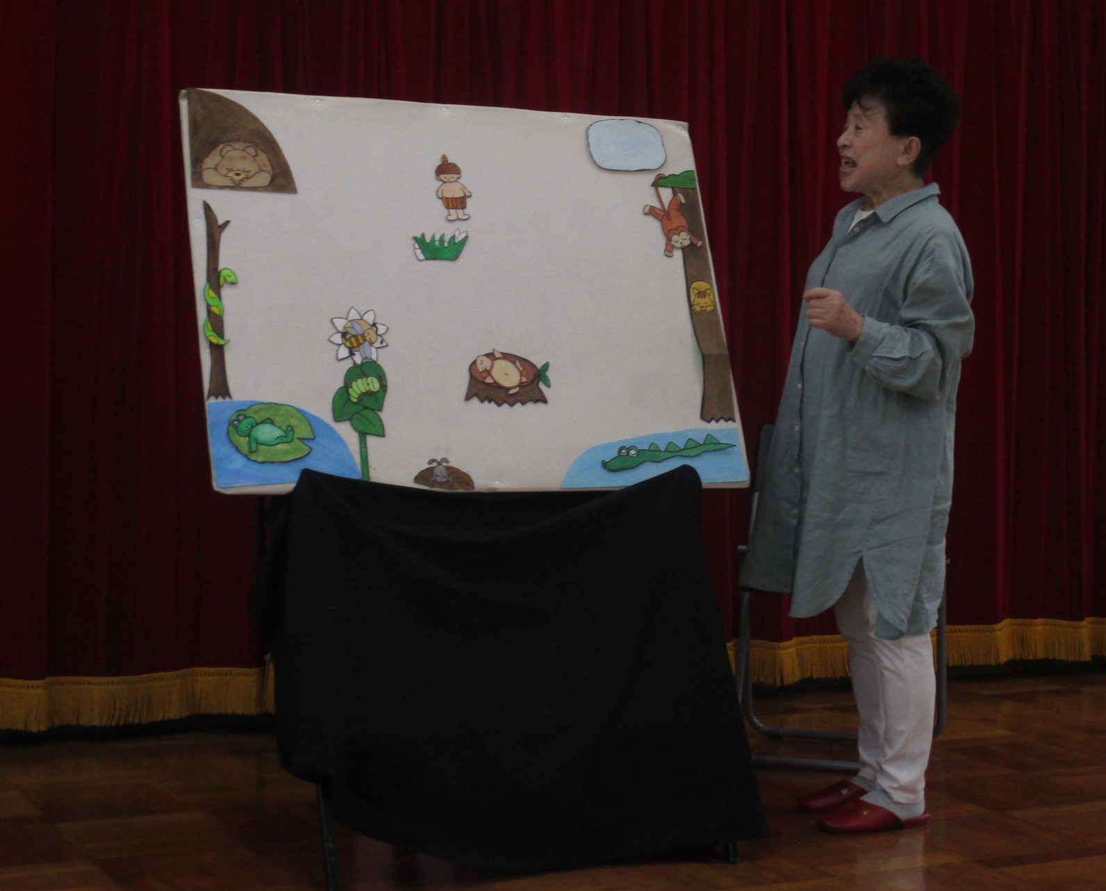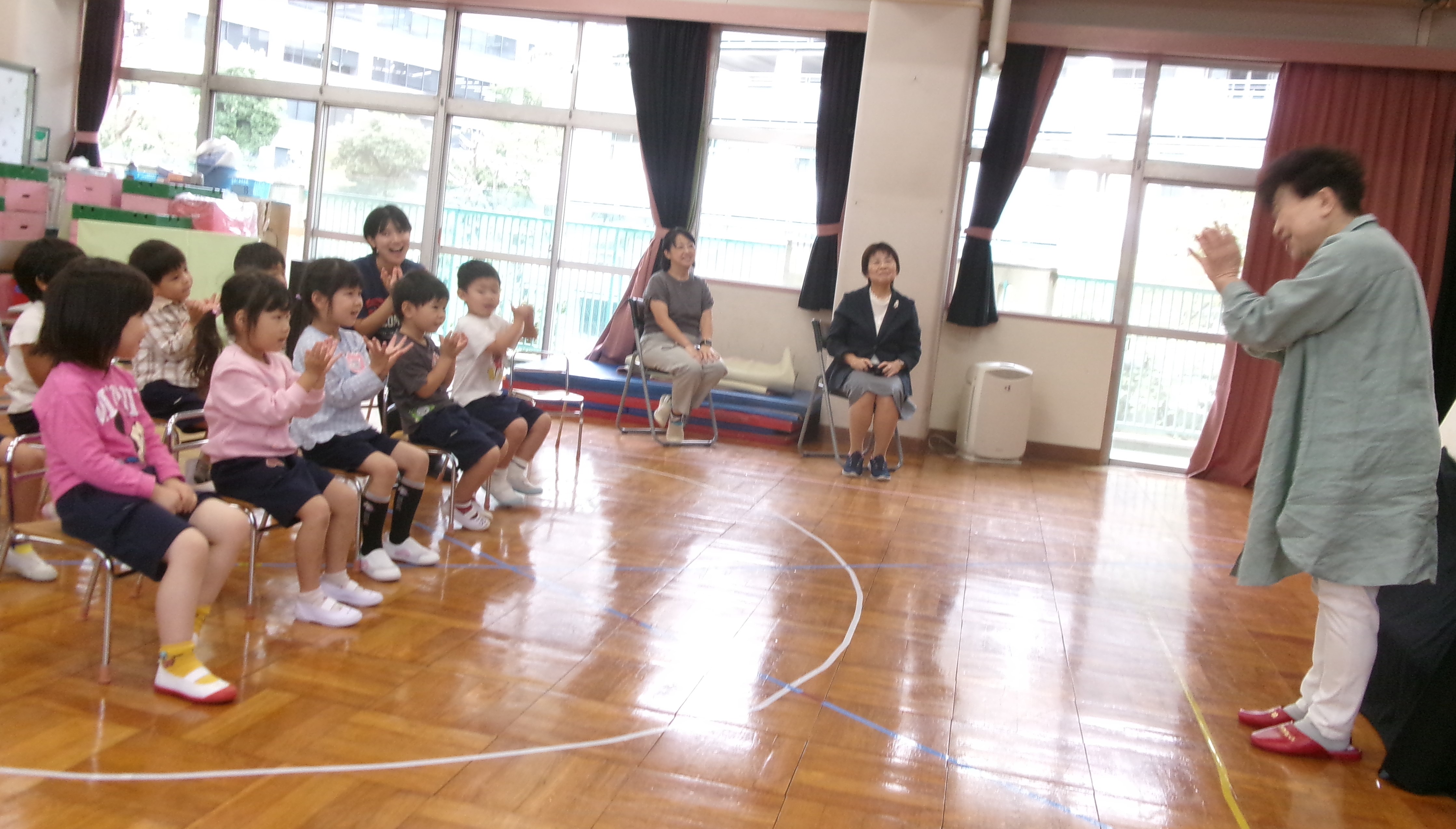 14日(火)尾松先生に来ていただき、手遊びや、パネルシアター、素話などをしていただきました。子どもたちは先生と一緒に手遊びをしたり、素話をよく聞きお話の世界を楽しんだりしました。また、未就園の友達も保護者の方と参加しました。