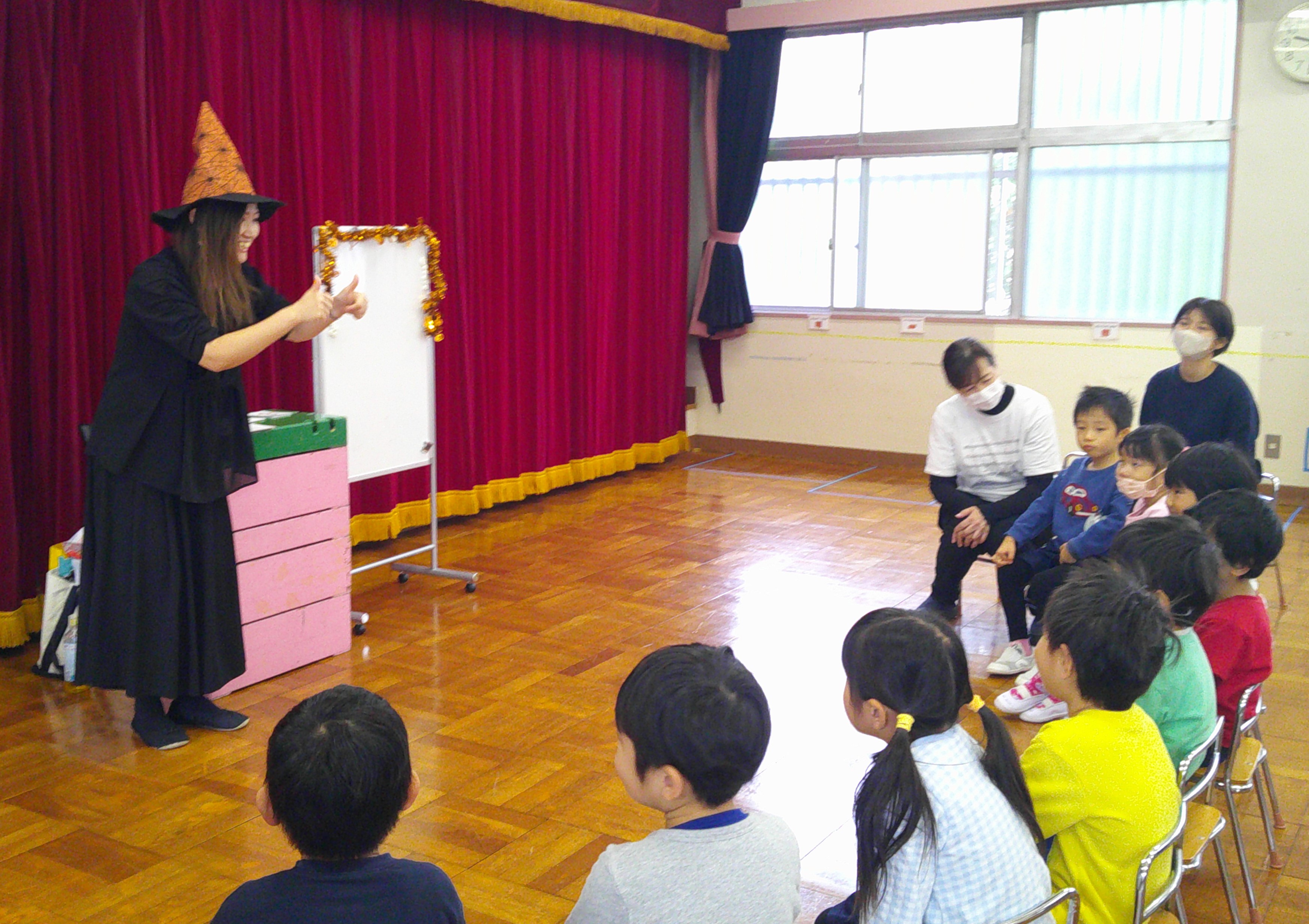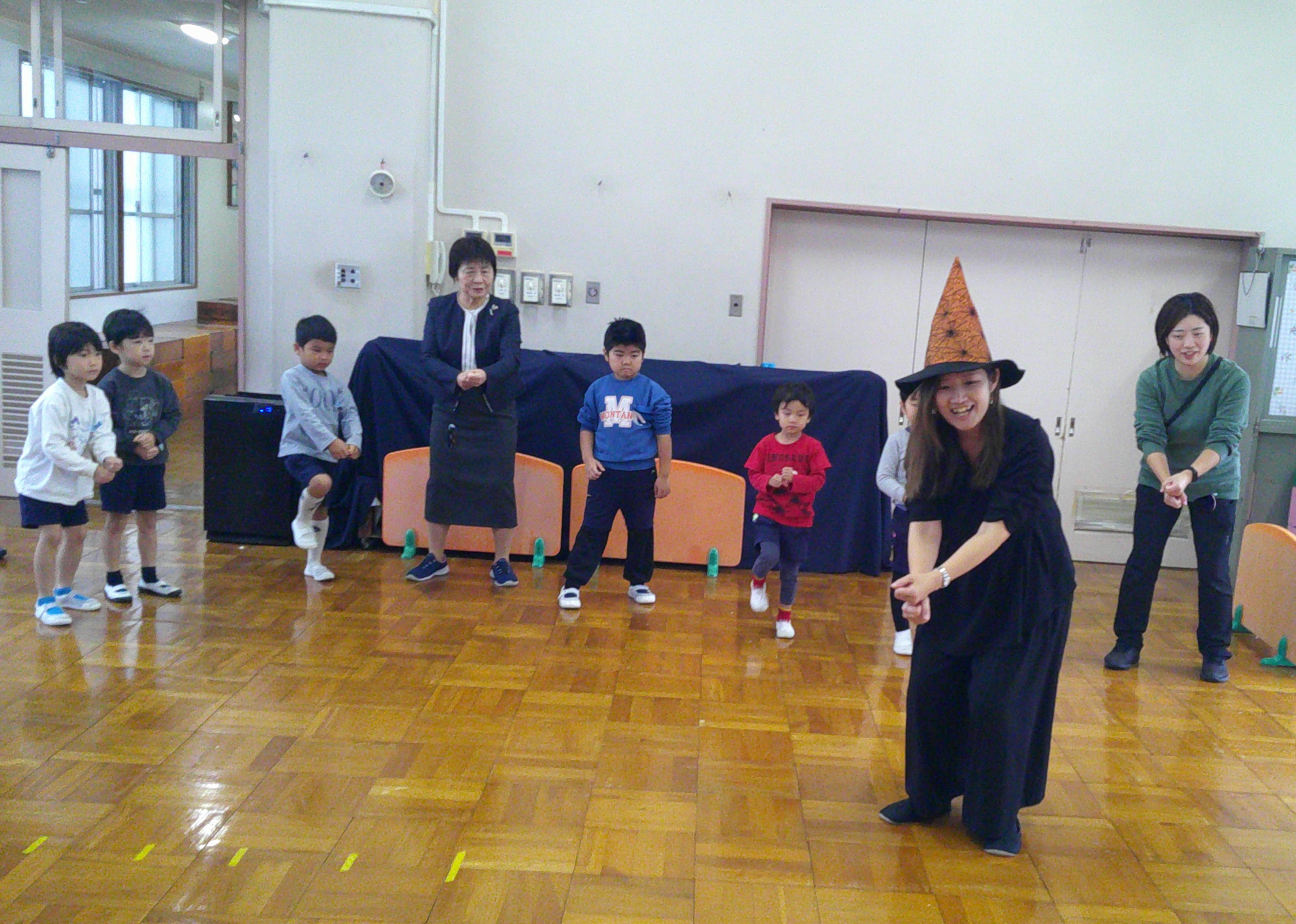 “Halloween”や“10witches”の曲に合わせて踊ったり、英語で答えるジェスチャーゲームや”Who are you?”ゲームなどをしたりして、英語に親しみました。
