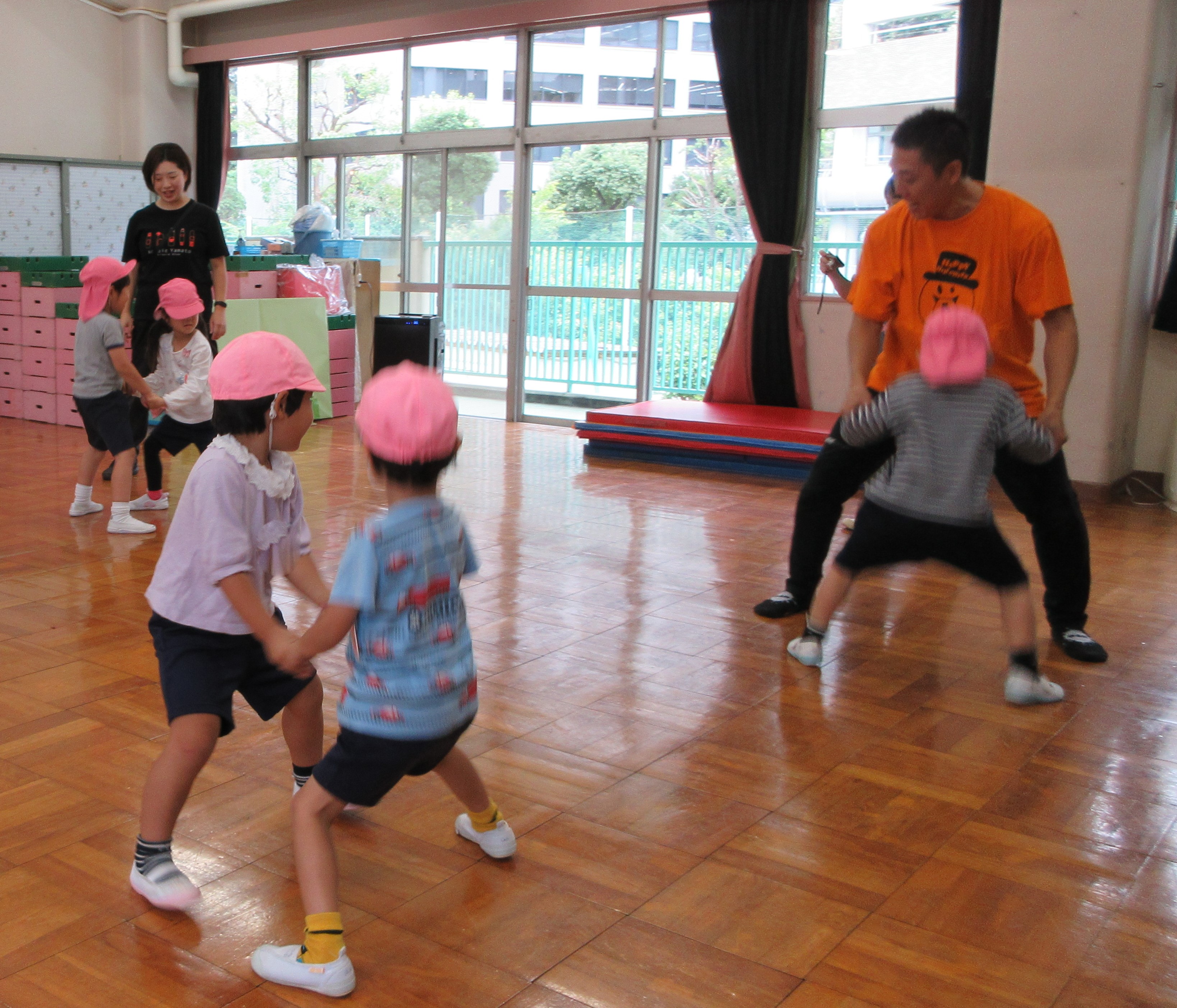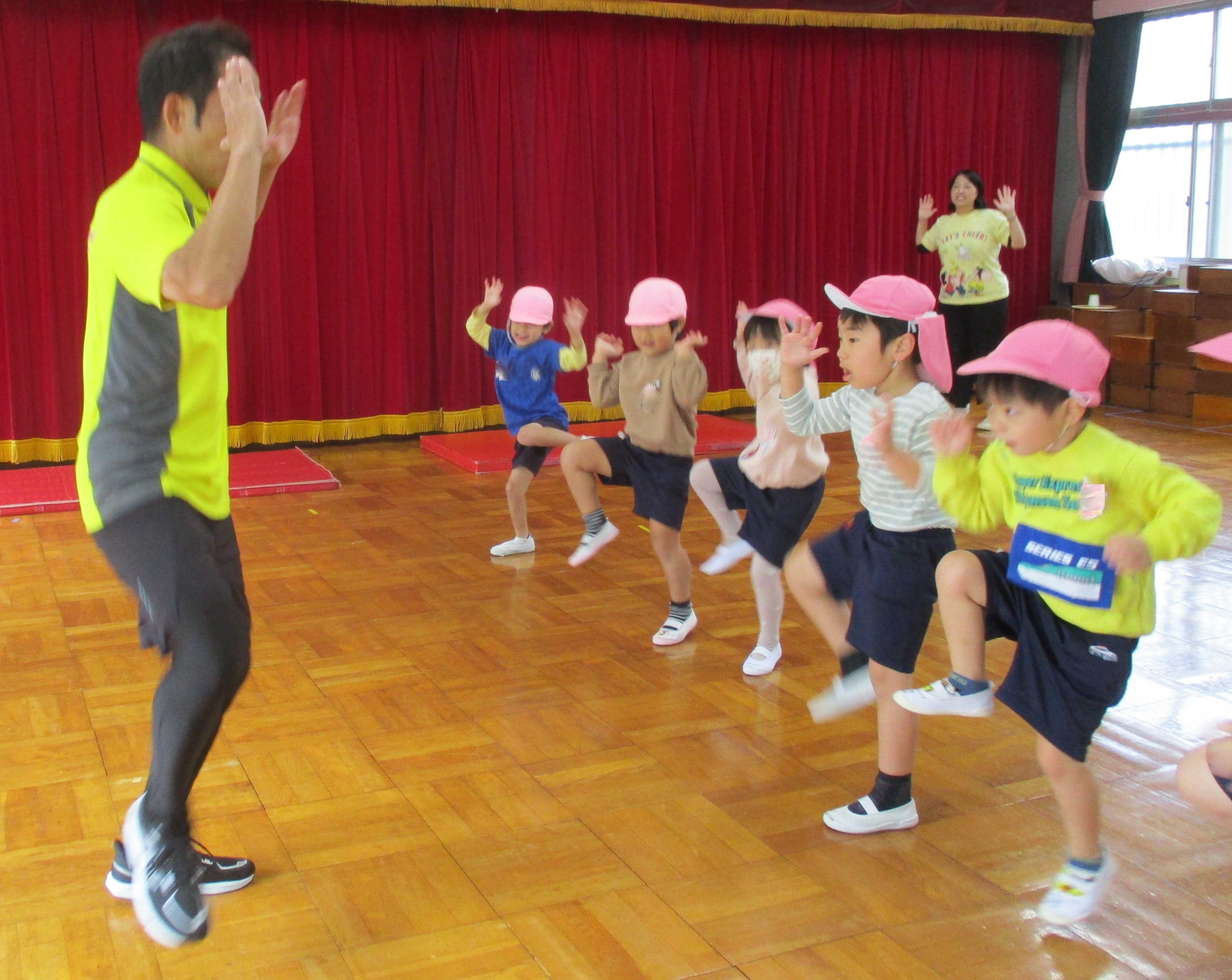 15日(水)斉藤先生に来ていただき、楽しく体を動かしました。運動会で自分の力を出したり、友達と一緒に取り組むことを経験してきた子どもたちは、先生の動きをまねたり、友達と一緒に体を動かす楽しさを感じたりしながら取り組んでいました。