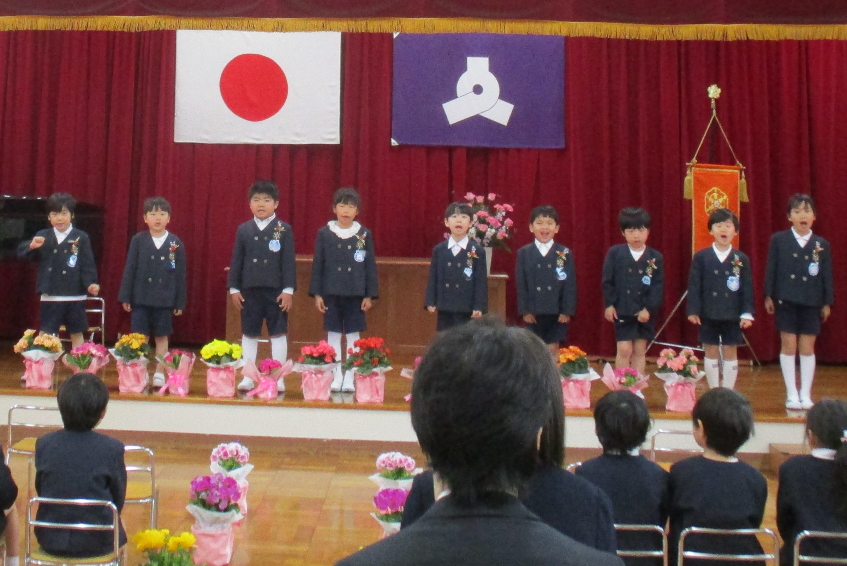 保護者の方に見守られながら、あお組一人一人が園長先生から修了証書を受け取りました。幼稚園で楽しかったこと、頑張ったことを振り返り、お別れの言葉を言ったり、歌を歌ったりし、自分たちの成長を感じながら式に臨んでいました。式の後には、もも組がお祝いの花束を渡したり、花道をつくったりして、園のみんなで門出をお祝いしました。