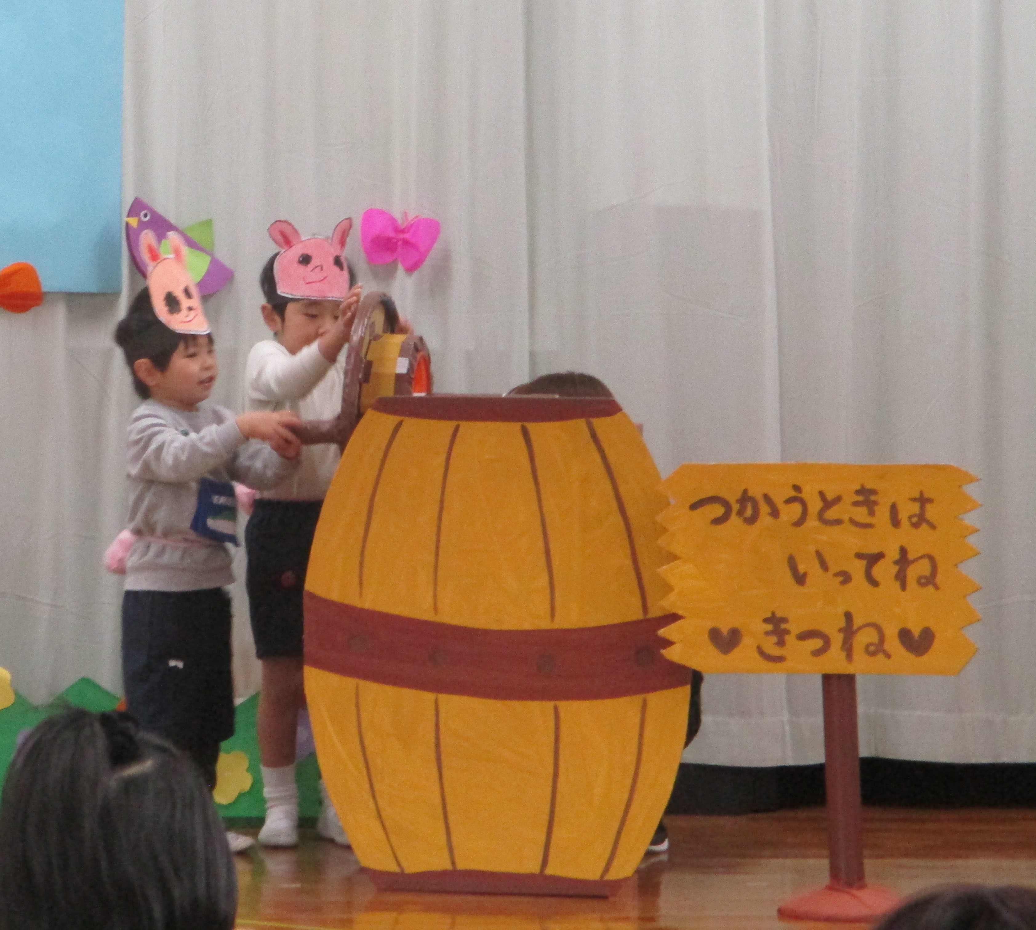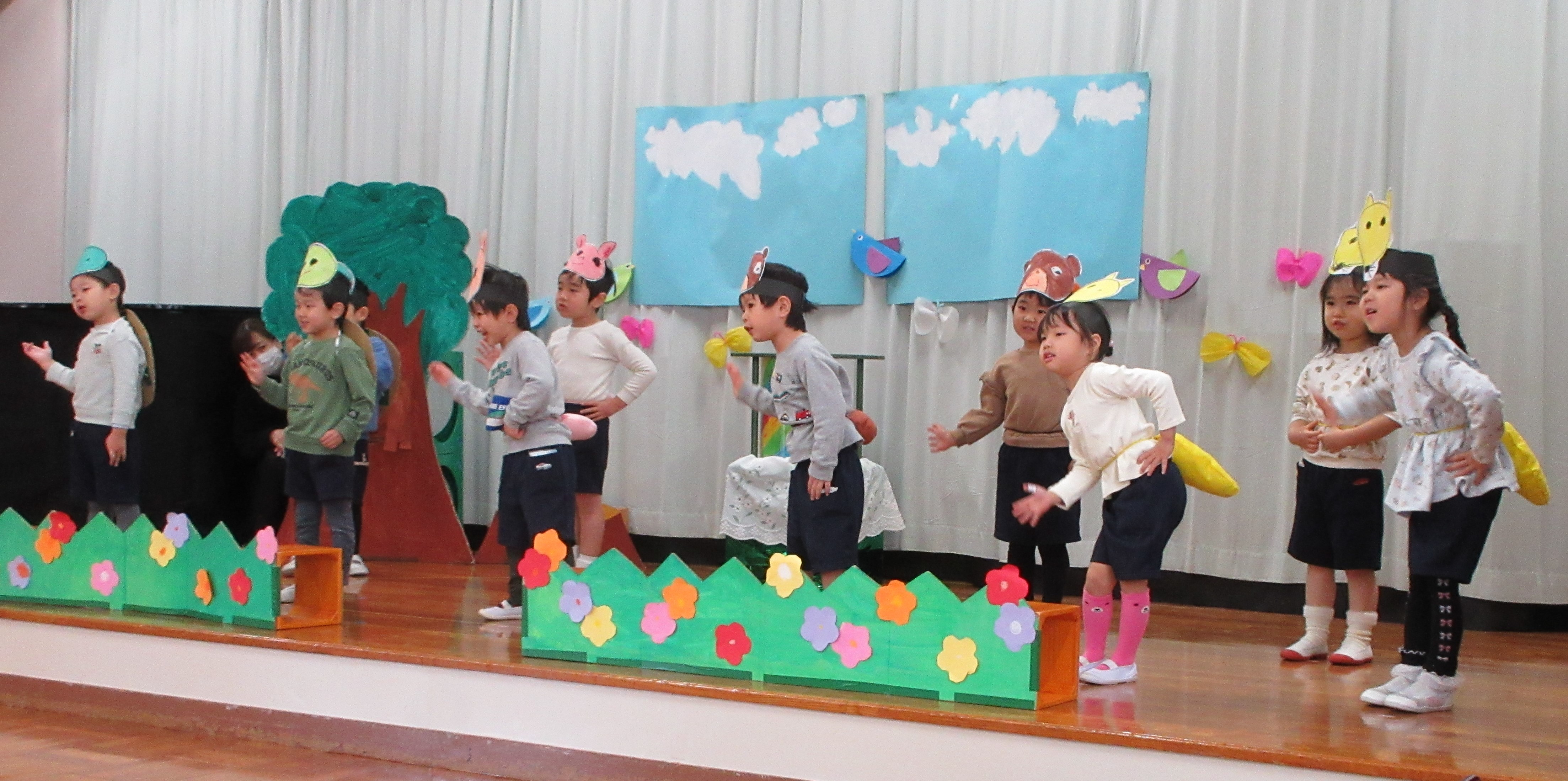 キツネ、ウサギ、カメ、クマに変身し、なりきって動いたり、友達と声を合わせて言葉を言ったりすることを楽しみました。自分なりにのびのびと表現したり、たくさんの拍手をもらったりして、ドキドキしつつも嬉しそうでした。
