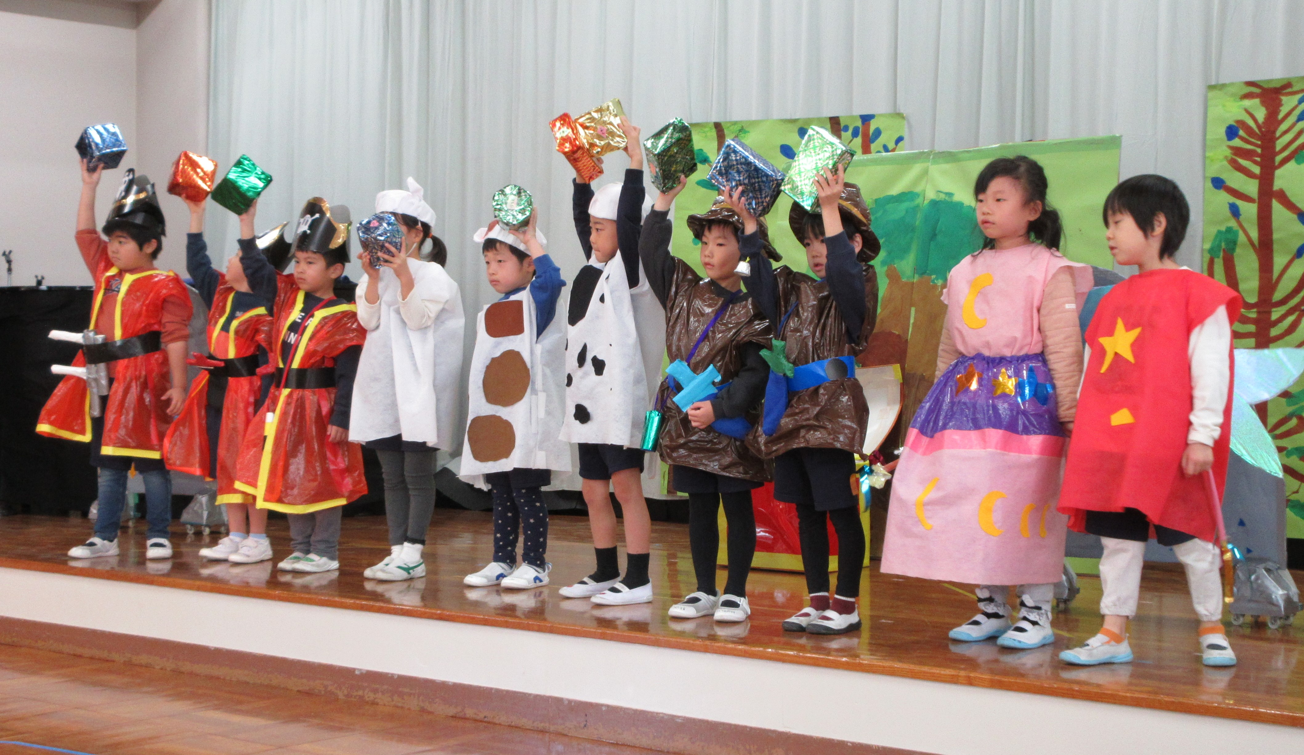 あお組の子どもたちが冒険家や動物、妖精、海賊などが出てくるオリジナルストーリーを考えました。大きな声で台詞を言ったり、自分の役になりきって演じたりすることを意識し、一人ひとりが自信をもって表現していました。また、劇に必要な衣装や小道具、大道具も、今までの経験を生かしながら自分たちで作りました。たくさんの拍手をもらったり、面白い場面では笑ってもらえたりしたことが嬉しかった様子でした。