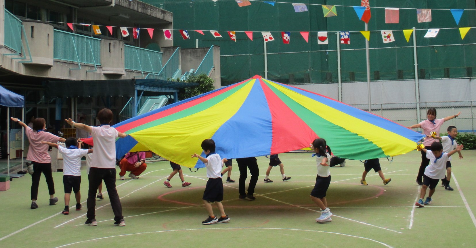 5歳児あお組は、折り返しのかけっこ、リズム(グループ表現や「タイムマシンに乗って」の音楽に合わせたダンス、パラバルーン)、団体競技(めくってめくって)と、たくさんの応援を受けながら、学級の友達と気持ちを合わせ、自分の力を発揮して頑張りました。また、競技だけではなく、運動会を進めていくために必要な司会や係の仕事にも気付き、みんなで分担しました。自分たちの役割を受け止め、“もっと素敵にできるようになりたい”と繰り返し取り組んできたことで、当日は自信をもって話したり動いたりする姿が見られました。