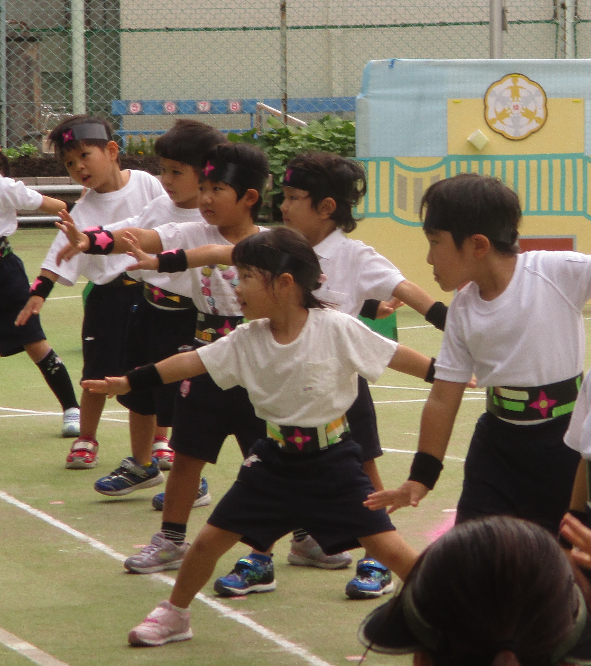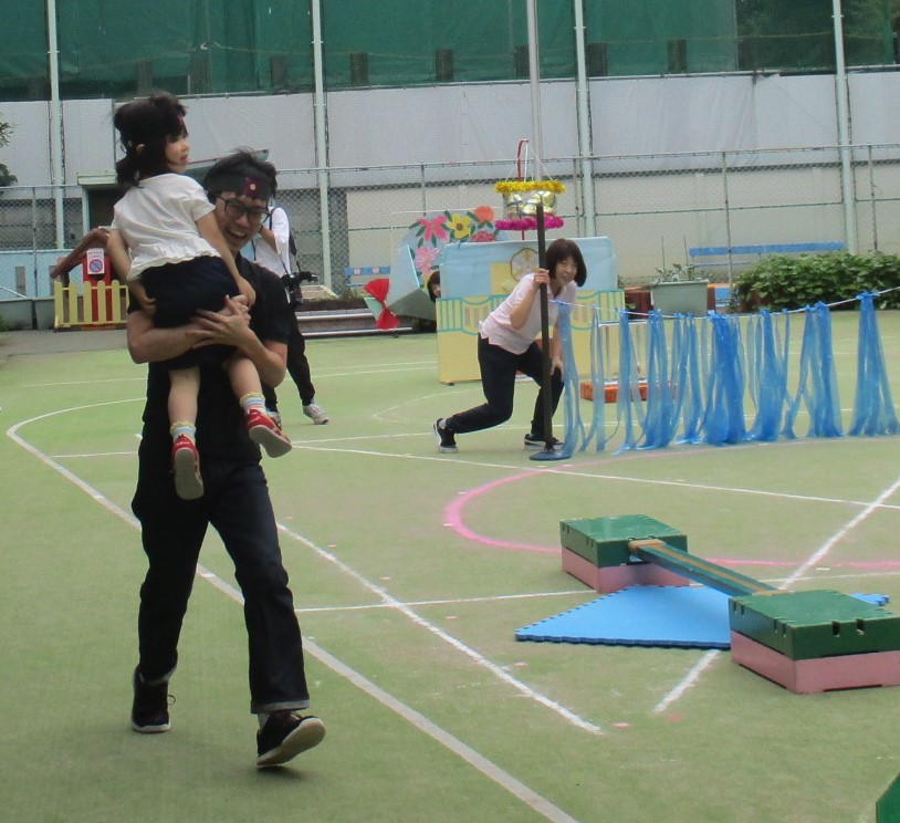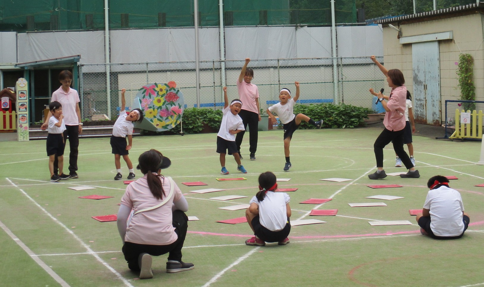 リズムでは“もも組忍者”になりきって様々な修行をしたり、お気に入りの「なろうぜニンジャ なれるぜニンジャ」の踊りを元気いっぱい踊ったりしました。また、親子競技では草むらを飛び越えたり、滝をくぐったりして“忍者の親子”で修行をし、“元気玉”を届けました。保護者の方と触れ合いながら一緒に取り組めたことが嬉しそうでした。