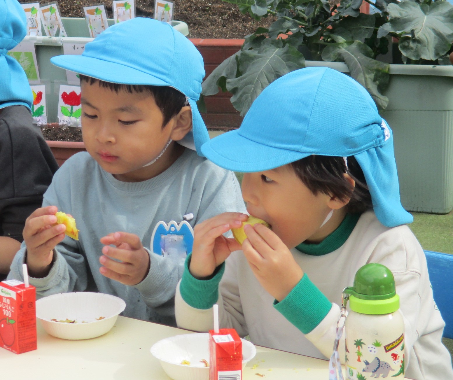 できあがったホクホクの焼き芋は、園庭で食べました。