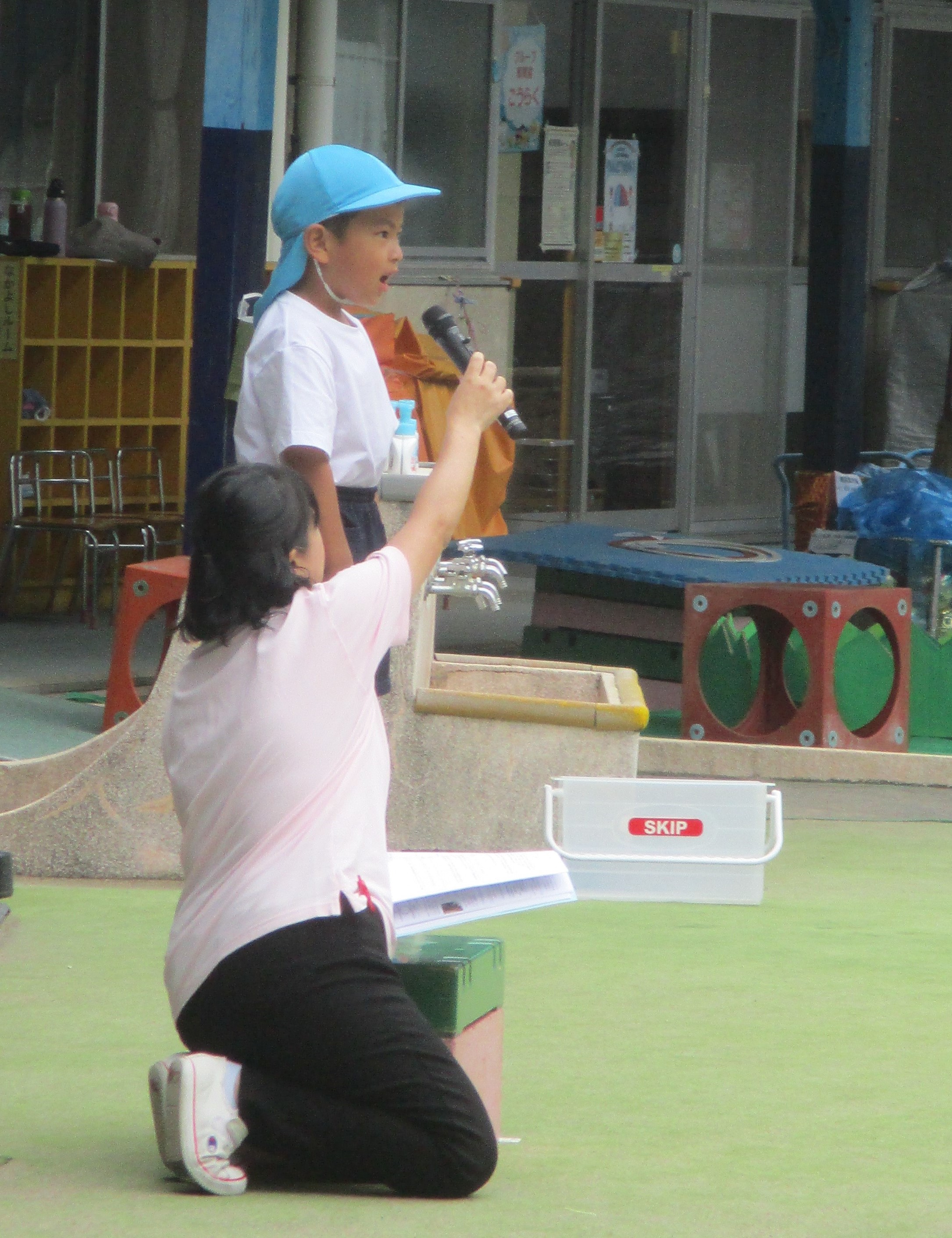 もも組とあお組がホールに集まり、園長先生の話を聞いたり、夏の約束を知ったりしました。また、学級で楽しんでいる歌も披露し合いました。