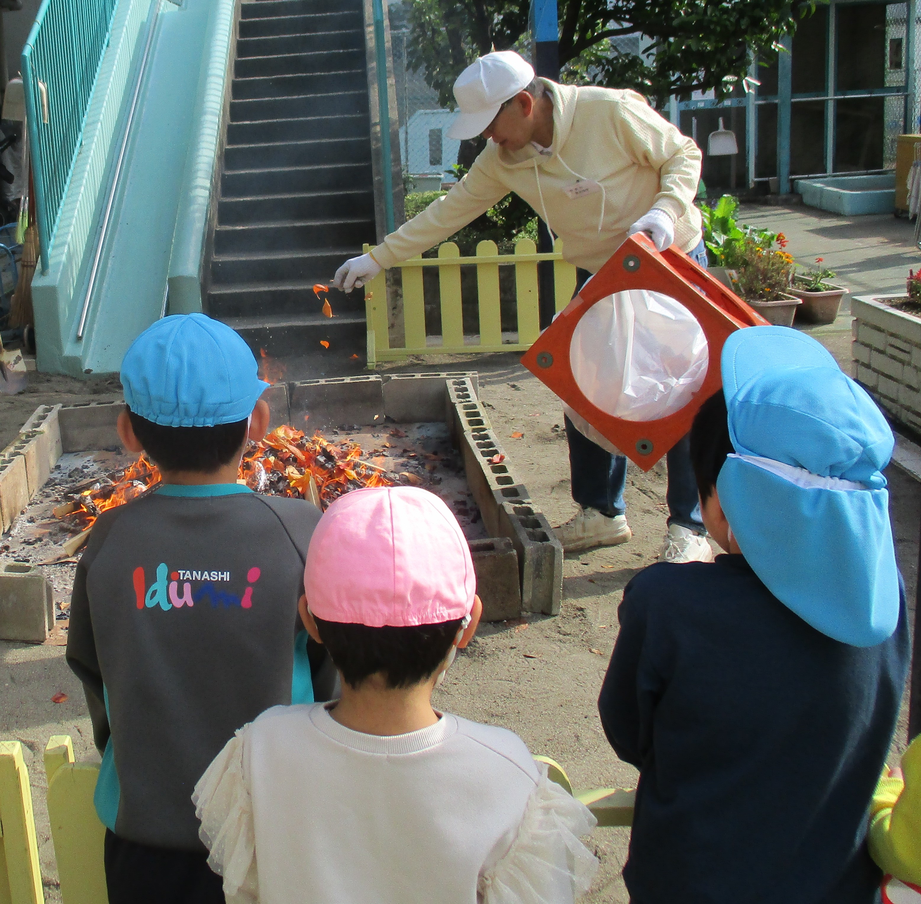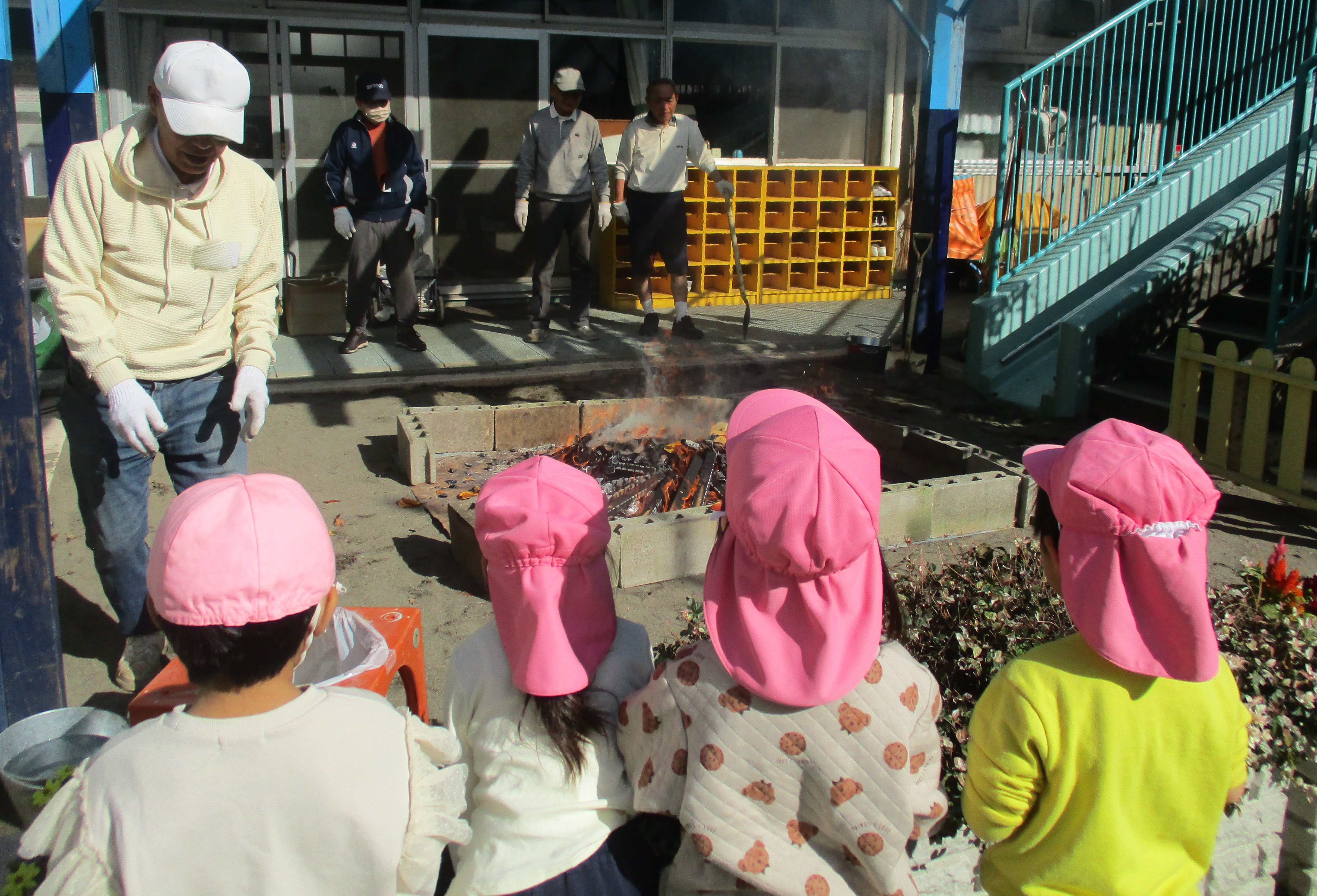 12日(水)地域の後楽クラブの方々に来ていただき、年長あお組が収穫したサツマイモを焼き芋にしました。