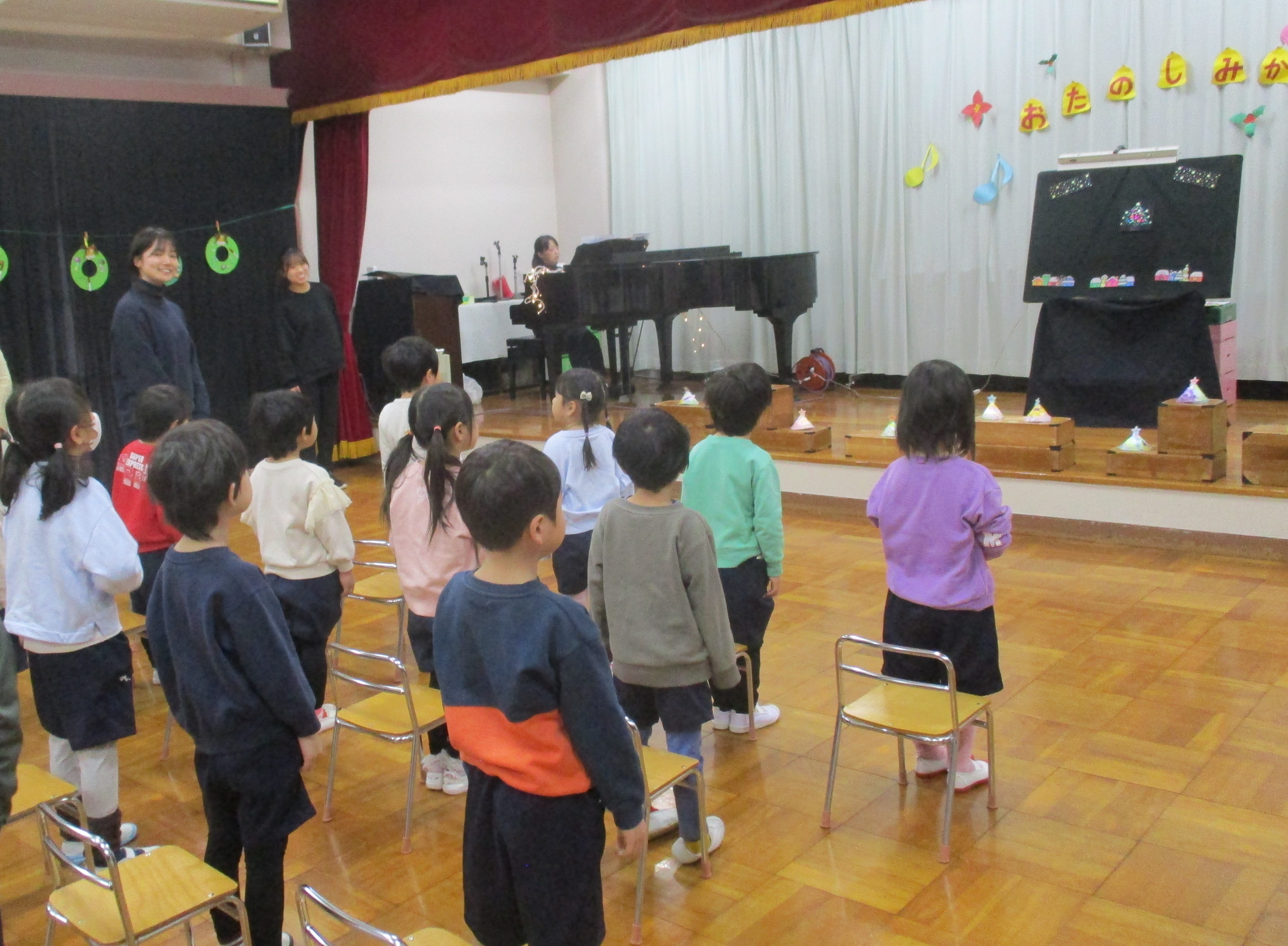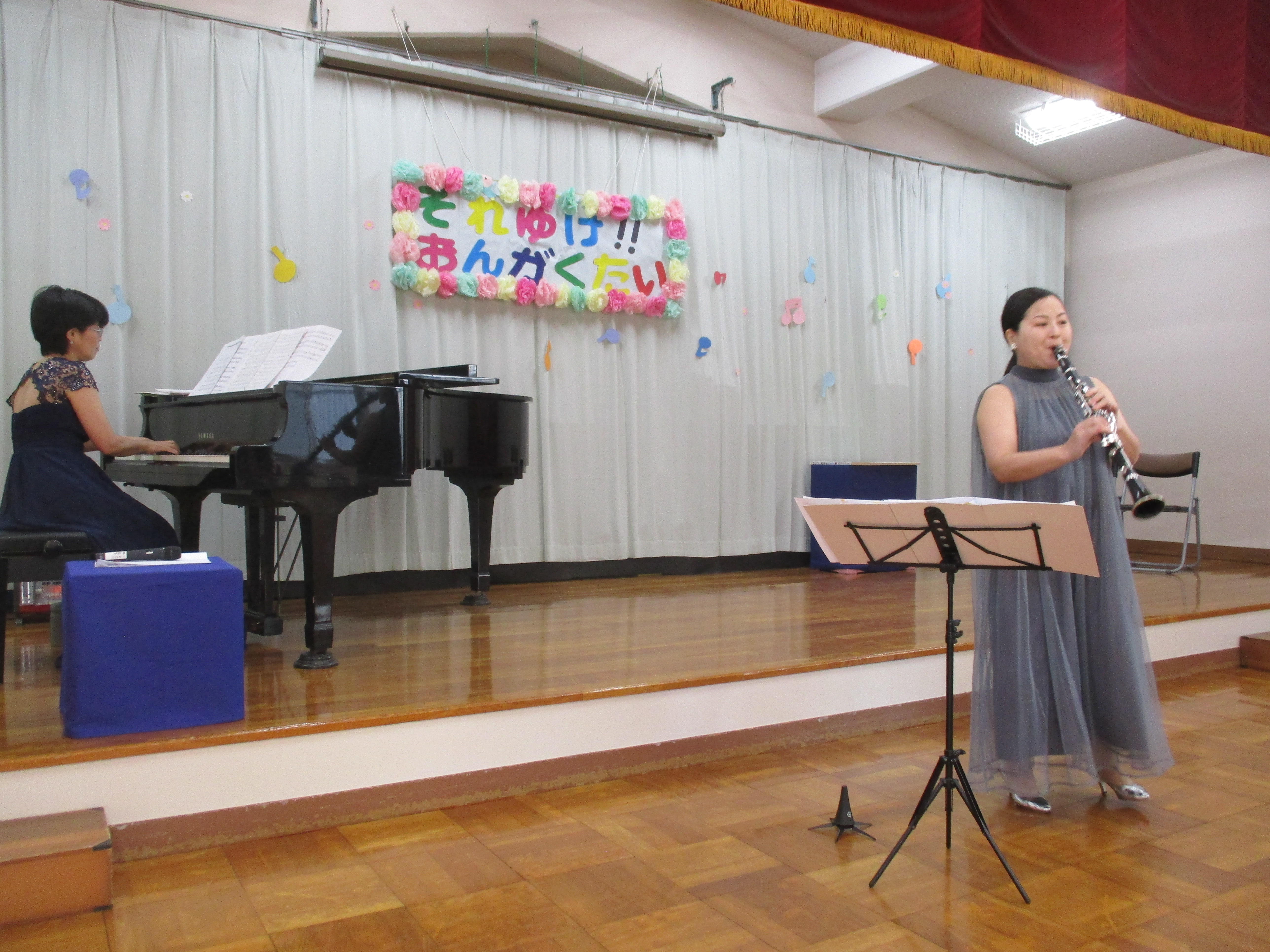 ピアノ 上野先生、クラリネット 井上先生をお迎えし、素敵な音楽に合わせ、手拍子をしたり体を揺らしたりしながら楽しみました。みんながよく知っているディズニーやジブリの曲の時には一緒に口ずさんだり、しっとりとした曲では曲想を感じながらゆったりと楽しんだりしました。
