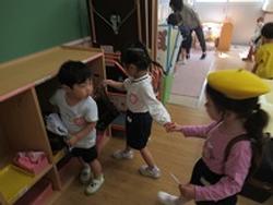 家庭的な雰囲気を大切にしながら3学年合同で過ごします。幼児の様子や気候に合わせて戸外で体を動かしたり、室内でカードゲームやプラレールで遊んだりします。