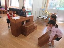 5歳児 ほし組 友達と大型積み木を組み合わせて家作りをしています。友達と声を掛け合い、力を合わせて作っています。 |