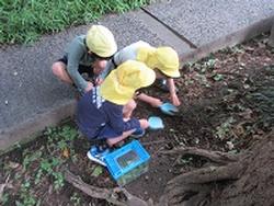 4歳児 はな組 弥生の森で虫探しをしています。自分の好きなことを見付けて、友達と一緒に発見を楽しんでいます。 |