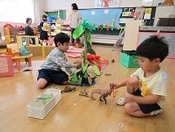 3歳児 りす組 「ガオー!」と大好きな恐竜のおもちゃで思い思いに遊んでいます。 |