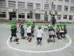 5歳児 広い校庭で伸び伸びと学級みんなでドッジボール。「がんばれ!」と友達を応援したり、「あたっちゃった」と悔しさを感じたり、友達と一緒にいろいろな気持ちを感じています。 |