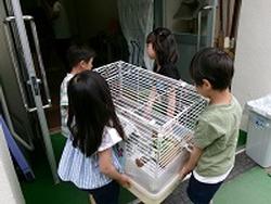 5歳児が当番でモルモットの世話 役割分担をしながら、協力して取り組んでいます。モルモットのため、そして、年長として園全体のために、自分ができることに取り組むことで自信が育っていきます。