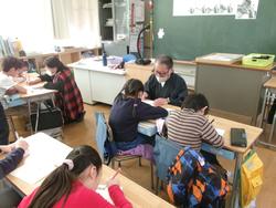 12月8日(月)、根津小学校の通知表の表紙絵を描いてくださったペン画家、スギヤマアートルームの杉山浩一様を講師にお迎えして、3年生にペン画教室を行いました。杉山さんからはペンの使い方や明暗の付け方など、ペン画の楽しさを教えていただきました。子供たちも初めは緊張しながら線を引いていましたが、慣れてくると自分なりに色の濃さを考えながら楽しく作品を作っていました。出来上がったクリスマスカードは家に持ち帰り、お家の方にこの日教わったことをお話ししました。とても充実した2時間でした。