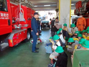 子どもたちは間近で見る消防車の迫力や、消防士さんのお話に興味をもっていました。