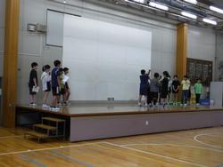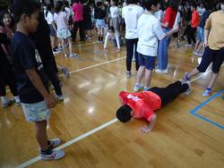 今朝は体育館で児童集会を行いました。運動委員会による、室内で体を動かすプログラムの紹介です。「人間知恵の輪」は、複数人で輪になりランダムに握手をして知恵の輪を作ります。手を放さずに腕がほどければ完成!「腕が痛い場合は手を放してください」の説明がありましたが、運動委員のみなさんはらくらく完成させていました。「じゃんけんスクワット」は、じゃんけんで負けた人がスクワットをします。ときにはスクワットが腕立て伏せに変わります。子供たちも運動委員の合図で何回か挑戦しました。暑さで校庭遊びができない日が続きましたが、この後は「秋の長雨」で外遊びができないときに活躍しそうなプログラムでした。