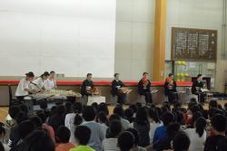 今日の3時間目は邦楽教室を行いました。「集団・日本の音」の方々17名による演奏を鑑賞しました。体育館に響き渡る和楽器の音色は時に優雅で、時に力強く体全体で楽しめました。3曲目の「ライラック」では、聞きなれた曲がいつもとはまったく違う響きに子供たちも身を乗り出して聴いていました。続いて筝曲・長唄「東京音頭」は音楽に合わせて会場全員が手拍子で演奏に参加しました。盆踊りで耳にする「東京音頭」より上品な感じがしました。長唄「京鹿子娘道成寺」は迫力ある演奏に圧倒され、大曲にも関わらず、子供たちも神妙な面持ちで聴いていました。