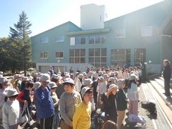 あっという間に学園での生活も最終日です。みごとな秋晴れの空のもと、朝の会はグラウンドで行いました。朝食の後はスポーツ大会。ボッチャを楽しみました。2日めは園での野外活動ができなかったため、昼食前に学園の職員の方に案内していただき、少し散歩をしました。高原の空気はすがすがしく、林の中を気持ちよく歩きました。3日間食堂で班ごとに食べた食事はどれもおいしく、食事係の準備やみんなで協力した片付けもよい経験になりました。(写真は二日目の朝ごはんの準備の様子です。)昼食後、根津小学校のみなさんと一緒に閉園式を行い、帰路につきました。