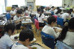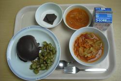 毎年1月24日から30日までの1週間は文部科学省が定めた全国学校給食週間となっています。(全国学校給食週間について:文部科学省)少し先取りですが、礫川小の給食を紹介します。今日の献立は「チョコレートパン・ABCミネストローネスープ・青のりポテトビーンズ」です。給食は児童が喫食する30分前までに管理職が検食をして、安全に提供できるかの確認をします。今日は一品づつの味はもちろん、見た目の彩りや甘さ・しょっぱさのバランスが良く、何よりトレー全体が楽しくなる献立でした。(小さいスープはアレルギー除去食、チョコレートのかけらはおまけです。)毎日調理をしてくださる栄養士・調理員のみなさんに感謝です。給食時には、放送委員会が献立についてのアナウンスをします。子供たちは今日も「おいしい」「おかわりする」と笑顔いっぱいでした。
