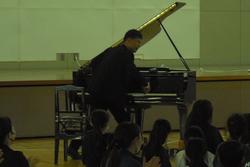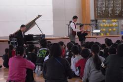今日の3時間目に楽団「エバリー」のお二人が、音楽鑑賞教室を開いてくださいました。ヴァイオリンとピアノのデュオで、モーツァルトのトルコ行進曲で始まり、ルパン三世やリズムゲームなどで子供たちは手拍子をしたり、体を動かしたりと楽しい時間を過ごしました。体を動かしたあとに、目を瞑って、口を閉じて聴いたパッヘルベルのカノンでは「目を開けて聴いているときより素敵な音がしました。」という感想もありました。あっという間の時間でしたが、音楽の美しさや楽しさを体験でき、心の栄養になりました。5年生は6時間目に鼓笛活動で移杖式に向けてパート練習をしました。6年生がサポートしてくれたので、練習がはかどったのではないでしょうか。移杖式での演奏が楽しみです。