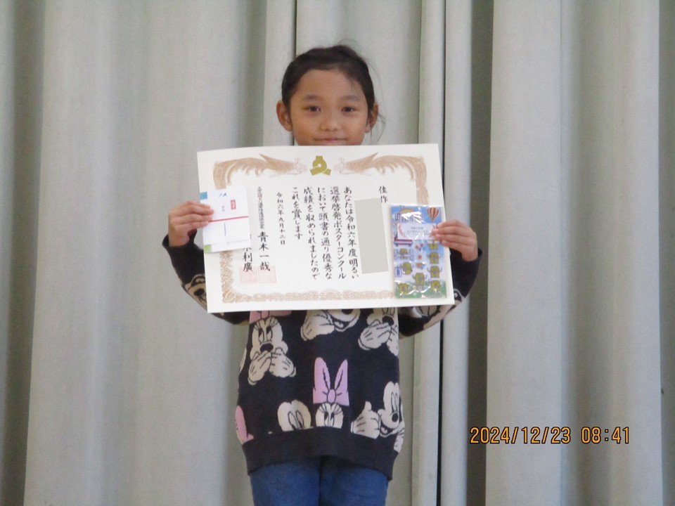 12月23日(月)の全校朝会では、表彰を行いました。本日は、「明るい選挙啓発ポスターコンクール」と、「第十六回東京都学童女子野球リーグ戦」の表彰です。体育館には全校児童からの大きな拍手が響き渡りました。
