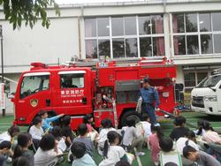 小石川消防署の方が来て、消防署の仕事の話やポンプ車の詳しい説明を聞きました。消防署の仕事は交代制で、どんなときも出動できるように待機していることなどを聞き、私たちの生活はいろいろな人に支えられていることを知りました。