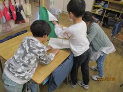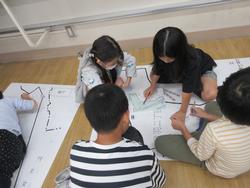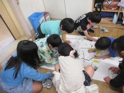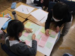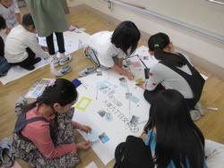 10月17日にフィールドワークへ行き、危険なところ、安全なところを確認し、写真に撮ったり地図に記録をしたりしました。その記録をもとに各グループに分かれてカードを書き、大きな地図に貼り、安全マップ作りをしています。完成後発表会をする予定です。