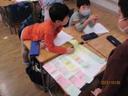 30日(木)にインタビューをして、「見たこと、聞いたこと、思ったこと」に分けたものをグループで似ている意見にまとめることができました。まとめることで、児童から「見やすくなった。」や「いろいろなまとまりがあった。」などの気付きがある学習になりました。