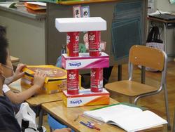 箱を使って形の学習をしました。「丸い形は角がないから転がりやすい」、「四角い形は積むときにグラグラしない」といった意見が子供たちから出ていました。どこまで高く積むことができるのか挑戦したり、紙に形を写して絵を描いたりするなど思い思いの作品を作っていました。空き箱の用意にご協力いただき、ありがとうございました。