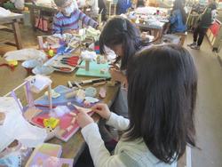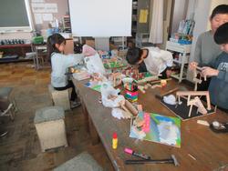 図工の『くぎちゃんランド』では、自分の思いを基に、木切れの効果的な積み上げ方や組み合わせ方を考えたり、試したりしながら作品を作りました。くぎちゃんのお部屋を作ったり、公園を作ったり…。自分の世界を表現することを楽しみました。
