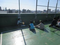 鏡を使って、はね返した日光が当たったところの温度を調べる実験をしました。1枚より2枚、2枚より3枚のと、はね返した日光を重ねて集めるほど、日光が当たったところは、明るく、あたたかくなりました。
