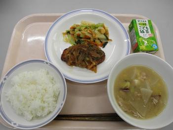 ご飯 豆腐入りハンバーグ和風ソース 青のりポテト みそ汁 牛乳 |