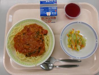 | 3 (金) | ツナトマトスパゲッティ コーンサラダ ぶどうゼリー 牛乳 | |