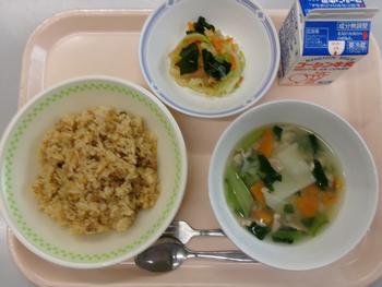 | 9 (木) | 豚ひき肉とキムチの混ぜご飯 ワンタンスープ こんにゃくとわかめのスープ 牛乳 | |
