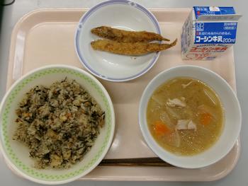 | 14 (火) | 大豆入りひじきご飯 ししゃもフライ 具だくさんみそ汁 牛乳 | |