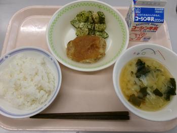 | 20 (月) | ご飯 豆腐入りハンバーグ 青のりポテト みそ汁 牛乳 | |