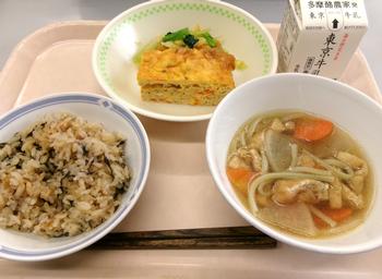 しょうゆめし ぎせい豆腐 野菜のあえ物 明日葉うどん汁 東京牛乳 |