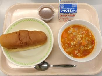 焼きカレーパン ミネストローネ ココアプリン 牛乳 |