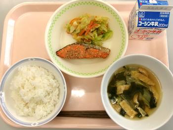 ごはん 鮭の焼き漬け 野菜とこんにゃくのあえ物 みそ汁 牛乳 |