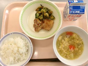 ご飯 鶏のしょうが焼き 青のりポテト 洋風卵スープ 牛乳 |