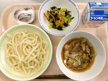 武蔵野うどん 野菜とわかめの甘酢あえ 米粉のココアケーキ 牛乳 |