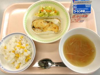 コーンライス 魚のホワイトソース焼き チーズ入りサラダ ジュリエンヌスープ 牛乳 |