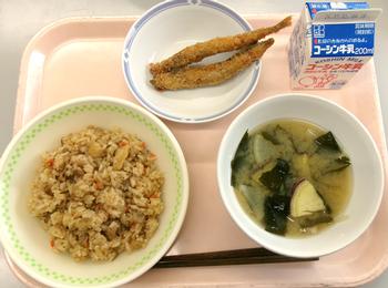 五目ご飯 ししゃものフライ さつま芋のみそ汁 牛乳 |
