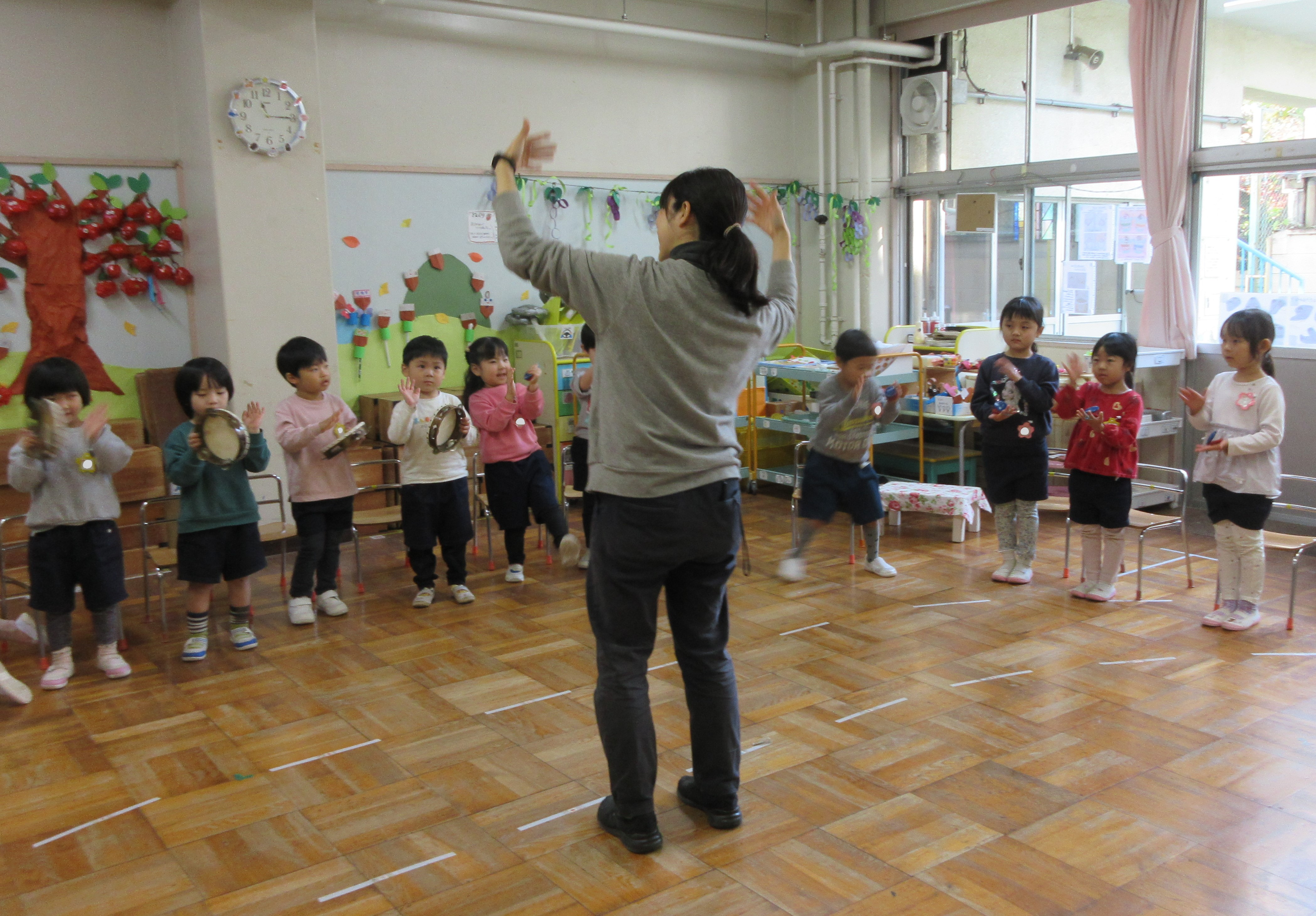 年中組の合奏では、これまでに親しんできたスズ、カスタネット、タンブリン、トライアングルを使い、「ビビディ・バビディ・ブー」の曲を行いました。「これは魔法の曲(魔法がかかる場面の曲)なんだよ」と曲の雰囲気を感じられるようにし、魔法をかけたりワクワクして踊ったりしているイメージで楽器の鳴らし方を考えました。
