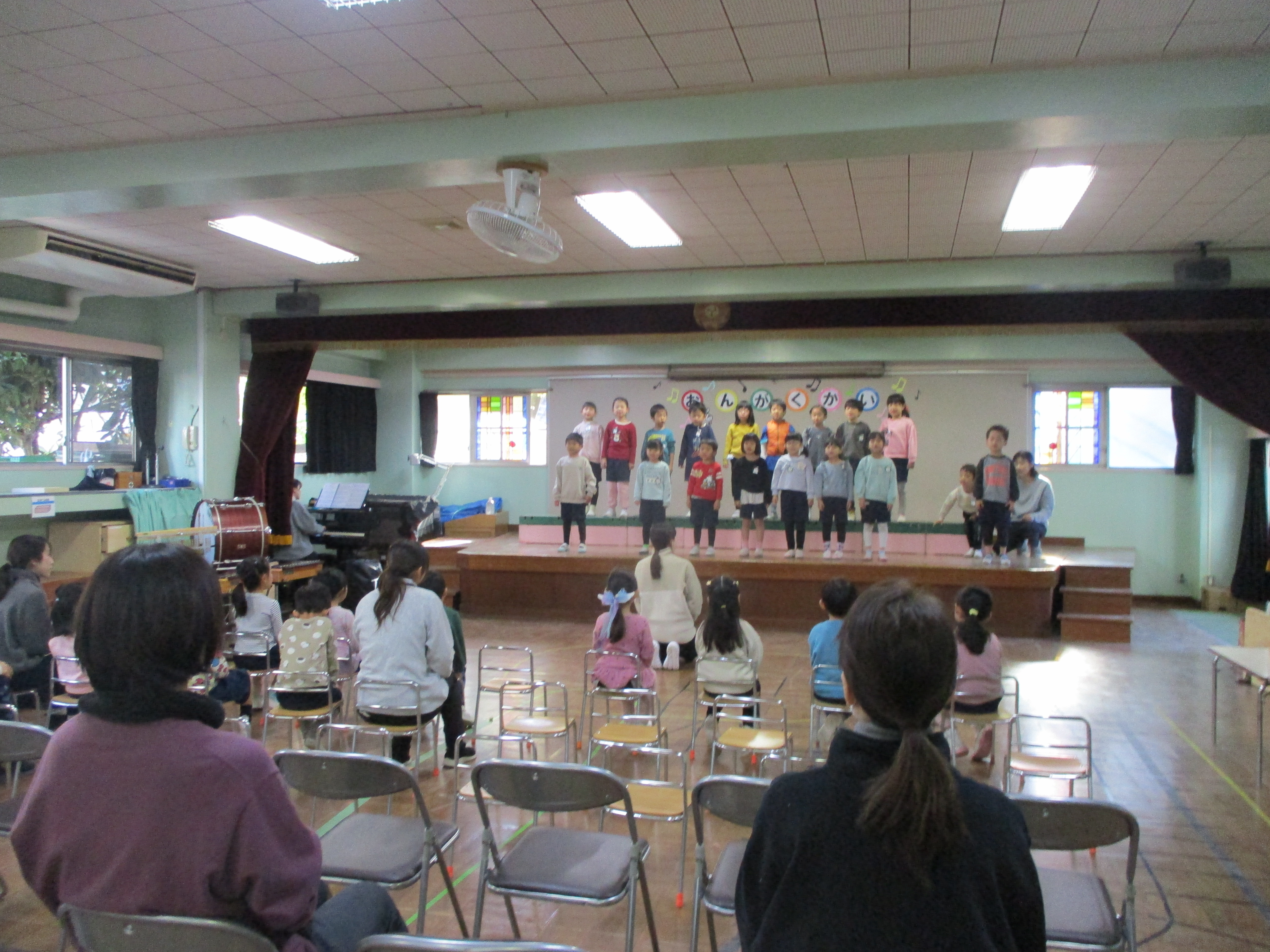 年長組の子どもたちは本当に歌が大好き!年長になり、いろいろな歌を歌えるようになりました。音楽会では「あおいそらにえをかこう」と「せかいがひとつになるまで」を歌いましたが、年少・中の頃に比べ、一曲が長くなったり、メロディーが難しくなったり、何より歌詞が抽象的なものになっていましたが、子どもたちは見事なまでに歌詞の表していることを読み取り、曲想を感じ取り、表現してくれました。聴いてくださった皆様の心に子どもたちの歌に込めた想いが届いたのではないか、と思います。
