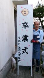 看板完成 用務主事の竹内さんが、学習発表会と卒業式の看板を作ってくださいました。非常に手の込んだ作品で、飾りや勘亭流の文字など、まるで芸術作品のようです。卒業式の看板には、桜の花びらが濃淡をつけて描かれており、華やかさが際立っています。学習発表会の看板には艶消しの処理が施されており、写真を撮っても光が反射しません。竹内さんは、生徒と保護者のみなさんのために心を込めて作ってくださいました。(9/24 11:30更新) |