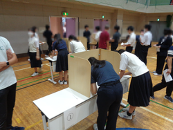 防災引き渡し訓練 お昼前ですが、防災引き渡し訓練を行っています。大きな地震で警戒宣言が出されたときに、生徒を安全に、そしてできるだけ速やかに保護者の方へお渡しするための訓練です。 |
