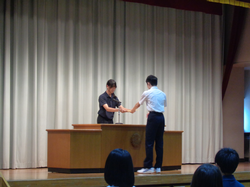生徒会朝礼 今週は、生徒会朝礼からスタートしました。 最初に、各学年の学級委員から「学習の継続的な努力の必要性」や「普段の学校生活における課題」などのお話がありました。続いて、10月の学習発表会のスローガンが発表され、「三原色~創ろう!努力の華~」に決まりました。学習発表会の実行委員長からは、「それぞれの色を出し、実りのある学習発表会になってほしいという願いが込められている」とお話がありました。最後に、美化コンクールの表彰と水泳の表彰、先週から活動している教育実習生の紹介がありました。 今週末には定期考査2がありますが、その後も様々な行事が予定されています。一人ひとりが計画性を持って、日々の生活に取り組みましょう。 (9/22 9:47 更新) |